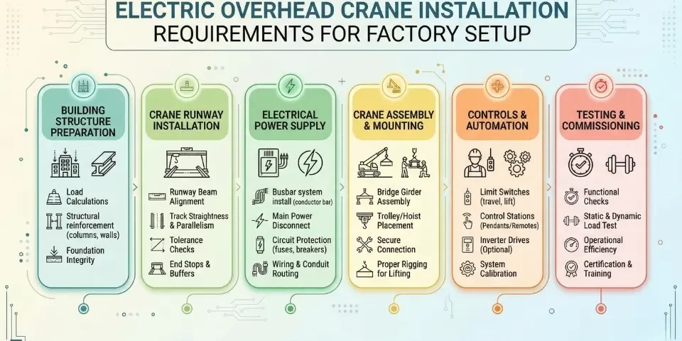 Each step ensures compliance with Electric Overhead Crane installation requirements.